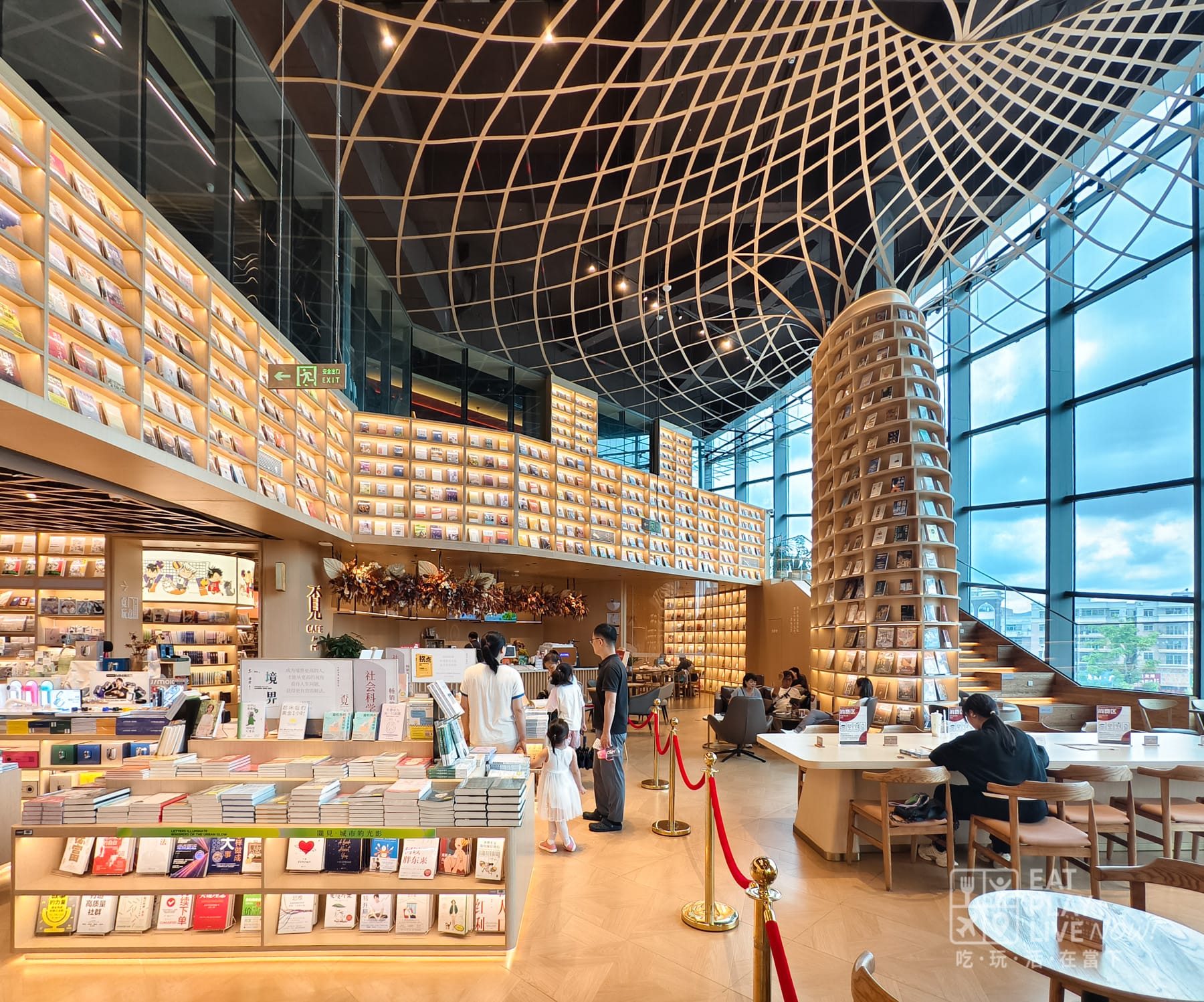 其實萬達廣場和其他珠海的購物中心差不多,個人認為整體設計不如上述三個商場吸引,店舖類型也相近。不過,它有一間非常漂亮的覔書店,設計運用了優美的幾何線條,打卡容易出片,對書蟲們來說,更是值得一探的地方。